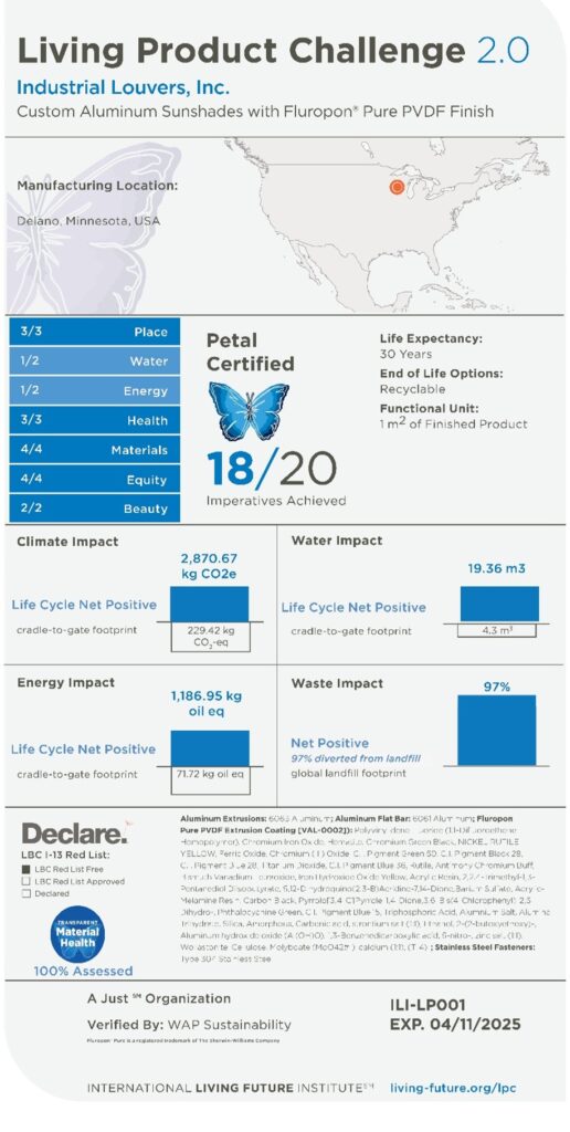 For sustainability-related technical questions, please contact Lisa Britton, CSI, CCPR, LEED AP BD+C, GGP at 763-972-7011 or lbritton@industriallouvers.com.